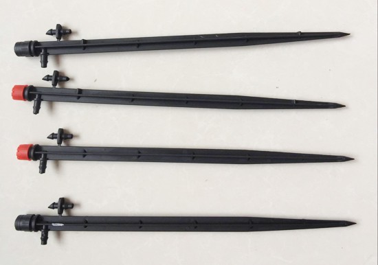 地插微喷组合中,常用的插杆长度为50公分左右,上部通过山字形转换接头将微喷头、毛管及插杆相连接,毛管另一侧通过毛管双接头与PE管连接。最后将插杆插入土壤固定好,地插微喷组合便完成了安装。